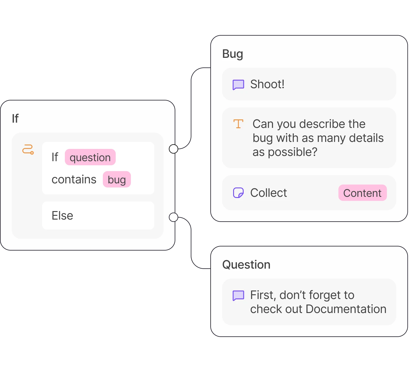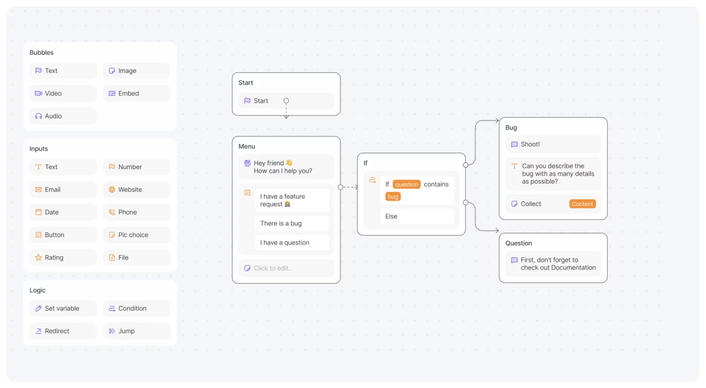 Customize your customer support chatbot with bubbles, input fields, logical action sequences, and integrations.